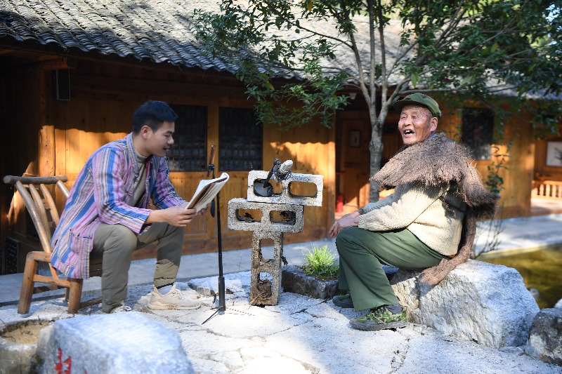 11月15日,彭國飛(右)和團隊伙伴彭超文在湖南湘西芙蓉鎮(zhèn)錄制短視頻。2020年初,75歲的彭國飛參加村里辦的鄉(xiāng)村“網(wǎng)紅”培訓(xùn)班,并獲贈一臺智能手機,遂開始了他的“網(wǎng)紅”生涯。飛爺爺和幾名“90后”組成團隊,一起策劃、錄制短視頻,直播銷售農(nóng)產(chǎn)品。由于風(fēng)格突出、內(nèi)容有趣,作品在短視頻平臺獲得眾多網(wǎng)友點贊。