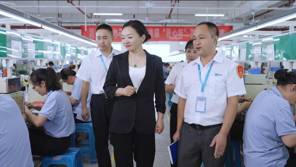 慧創(chuàng)集團董事長鄧倩(圖中)到車間檢查。