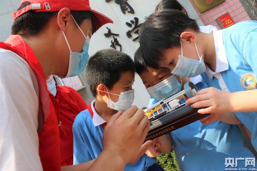 志愿者在引導長沙市特殊教育學校的孩子們用手觸摸盾構(gòu)機模型,并為他們講述地鐵建設(shè)的故事(央廣網(wǎng)發(fā) 受訪者供圖)