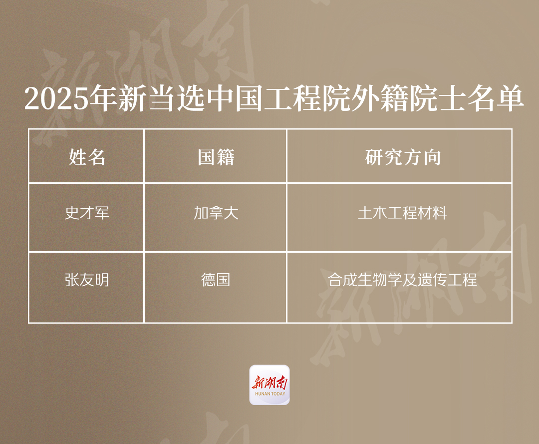 此外,湖南大學(xué)土木工程學(xué)院教授、博士研究生導(dǎo)師史才軍,岳麓山實(shí)驗(yàn)室研究員、湖南農(nóng)業(yè)大學(xué)兼職教授、湖南文理學(xué)院合成生物產(chǎn)業(yè)學(xué)院名譽(yù)院長(zhǎng)張友明當(dāng)選中國(guó)工程院外籍院士。