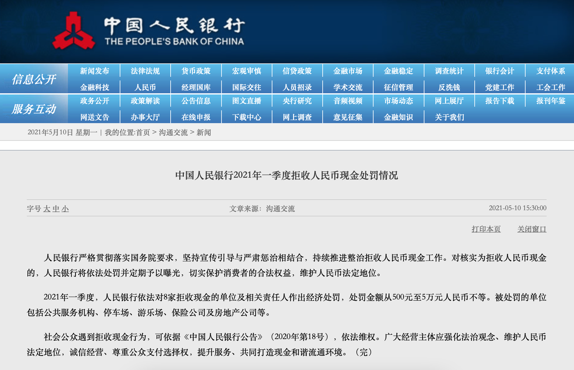 央廣網(wǎng)北京5月10日消息(記者 張圣琪)10日,央行網(wǎng)站發(fā)布消息稱,人民銀行嚴格貫徹落實國務(wù)院要求,堅持宣傳引導(dǎo)與嚴肅懲治相結(jié)合,持續(xù)推進整治拒收人民幣現(xiàn)金工作。對核實為拒收人民幣現(xiàn)金的,人民銀行將依法處罰并定期予以曝光,切實保護消費者的合法權(quán)益,維護人民幣法定地位。