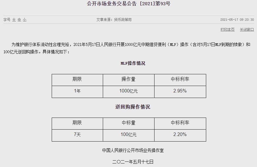 2021年5月17日,央行開(kāi)展100億元逆回購(gòu)操作和1000億元中期借貸便利(MLF)操作,操作利率分別為2.20%與2.95%。