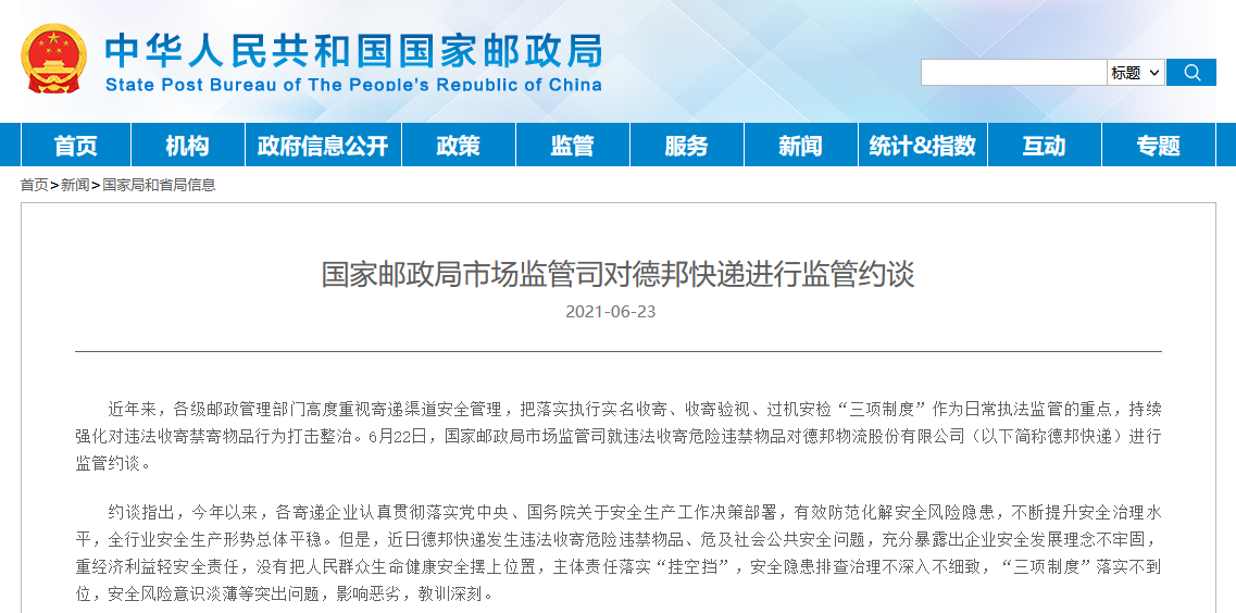 央廣網(wǎng)北京6月23日消息(記者 牛谷月)記者從國家郵政局官方獲悉,6月22日,國家郵政局市場監(jiān)管司就違法收寄危險違禁物品對德邦物流股份有限公司(以下簡稱德邦快遞)進行監(jiān)管約談。