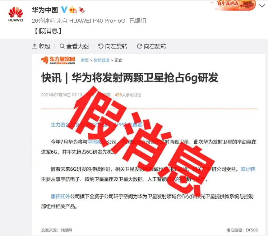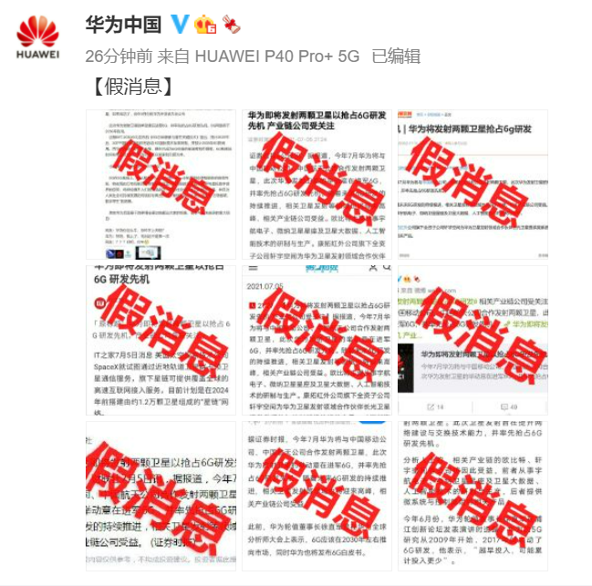 央廣網(wǎng)北京7月6日消息(記者 楊柳青)此前據(jù)媒體報(bào)道,今年7月華為將與中國移動(dòng)公司、中國航天公司合作發(fā)射兩顆衛(wèi)星,此次華為發(fā)射衛(wèi)星的舉動(dòng)意在進(jìn)軍6G,并搶占6G研發(fā)先機(jī)。6日上午,華為中國官方微博辟謠,“華為即將發(fā)射兩顆衛(wèi)星以搶占6G研發(fā)先機(jī)”為假消息。