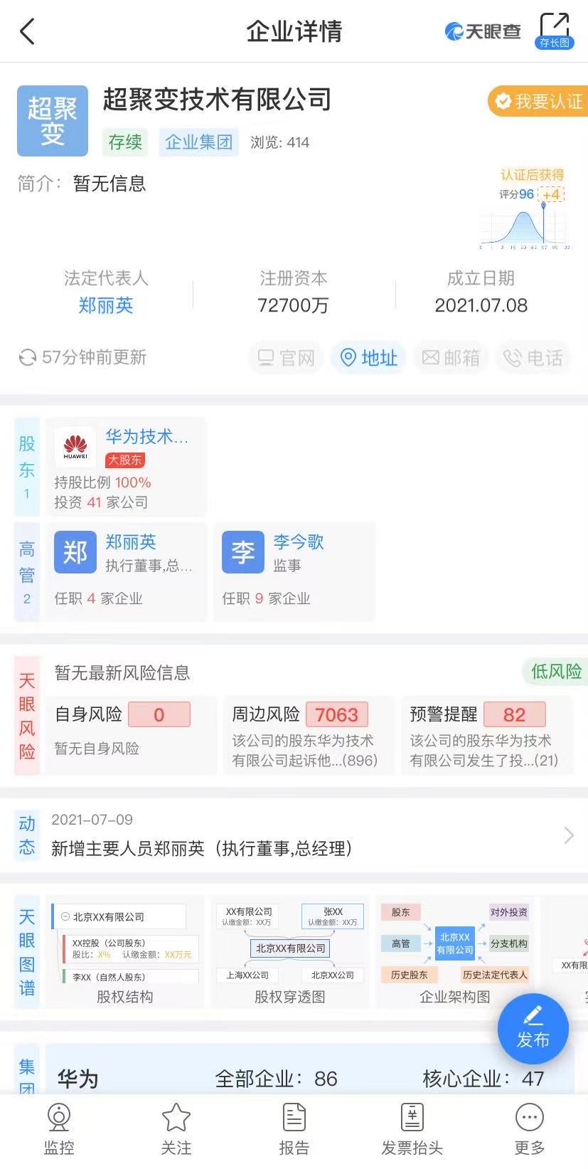 據(jù)天眼查顯示,7月8日,超聚變技術(shù)有限公司成立,注冊(cè)資本7.27億,股東信息顯示,目前該公司由華為技術(shù)有限公司全資持股。