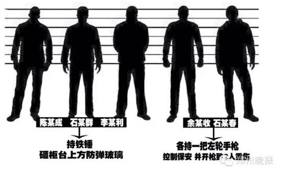 具體的分工是:余某收和石某春各持一把左輪手槍,負責(zé)控制值班的保安,并開了槍。石某群回憶,李某利和陳某成負責(zé)砸防彈玻璃,各砸了一個洞口,他接著砸,不到一分鐘玻璃砸開了,他們迅速鉆進入營業(yè)室用編織袋搶錢。