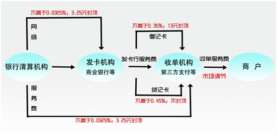 收單服務(wù)費由收單機構(gòu)向商戶收取,費改后不設(shè)定具體數(shù)額,由兩者協(xié)商決定。發(fā)卡行服務(wù)費由發(fā)卡機構(gòu)向收單機構(gòu)收取,分為借記卡和貸記卡兩套標(biāo)準(zhǔn)執(zhí)行:前者費率水平不超過0.35%,單筆收費金額不超過13元;后者費率水平不超過0.45%,不實行單筆封頂控制。網(wǎng)絡(luò)服務(wù)費由銀行清算機構(gòu)向發(fā)卡機構(gòu)和收單機構(gòu)收取,不超過交易金額的0.065%,單筆交易的收費金額不超過6.5元;由發(fā)卡、收單機構(gòu)各承擔(dān)50%。