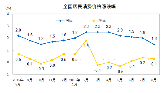 2016年8月份,全國(guó)居民消費(fèi)價(jià)格總水平同比上漲1.3%。其中,城市上漲1.4%,農(nóng)村上漲1.0%;食品價(jià)格上漲1.3%,非食品價(jià)格上漲1.4%;消費(fèi)品價(jià)格上漲0.9%,服務(wù)價(jià)格上漲2.1%。