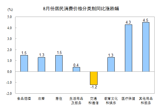 8月份,其他七大類(lèi)價(jià)格同比六漲一降。其中,其他用品和服務(wù)、醫(yī)療保健、居住、衣著、教育文化和娛樂(lè)、生活用品及服務(wù)價(jià)格分別上漲4.5%、4.3%、1.5%、1.3%、1.3%、0.4%;交通和通信價(jià)格下降1.2%。
