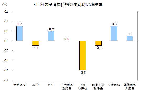 8月份,全國(guó)居民消費(fèi)價(jià)格總水平環(huán)比上漲0.1%。其中,城市上漲0.1%,農(nóng)村上漲0.1%;食品價(jià)格上漲0.4%,非食品價(jià)格持平;消費(fèi)品價(jià)格持平,服務(wù)價(jià)格上漲0.1%。