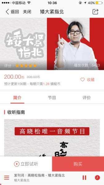6月12日,蜻蜓FM推出《矮大緊指北》,一檔由高曉松聊"詩與遠(yuǎn)方"的音頻付費(fèi)節(jié)目火了。此前,《曉說》、《曉松奇談》等節(jié)目為高曉松積累了一票粉絲,已然成為具有號召力的強(qiáng)勢IP。此前,蜻蜓FM上線的高曉松免費(fèi)音頻,累計播放量達(dá)9億。這些前期的免費(fèi)內(nèi)容已經(jīng)為高曉松的IP質(zhì)量打下了基礎(chǔ),粉絲不需要擔(dān)心購買的內(nèi)容是不是自己所需要的,不需要戰(zhàn)戰(zhàn)兢兢擔(dān)心內(nèi)容質(zhì)量是否優(yōu)秀且穩(wěn)定,高曉松提供的知識+情懷已經(jīng)順理成章的從免費(fèi)走向付費(fèi)。