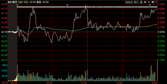 今日,美的集團(tuán)早盤迅速拉升一度漲1%,隨后有所下挫,臨近午盤時一度拉升至當(dāng)日最高點。該消息傳出后快速下行,保持低位徘徊,截至收盤美的集團(tuán)漲0.89%,報43.16元/股。
