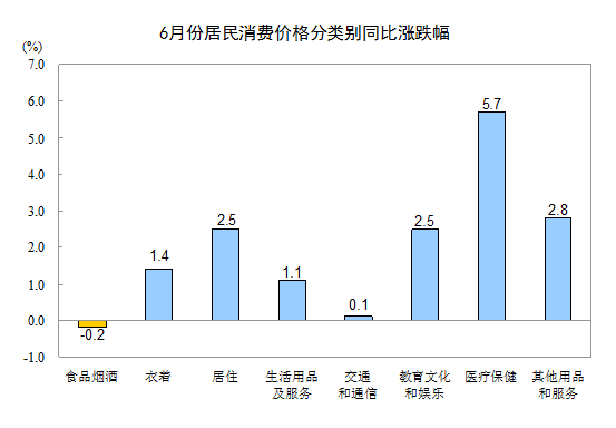 6月份,其他七大類價(jià)格同比均有所上漲。其中,醫(yī)療保健價(jià)格上漲5.7%,其他用品和服務(wù)價(jià)格上漲2.8%,居住、教育文化和娛樂(lè)價(jià)格均上漲2.5%,衣著、生活用品及服務(wù)、交通和通信價(jià)格分別上漲1.4%、1.1%和0.1%。