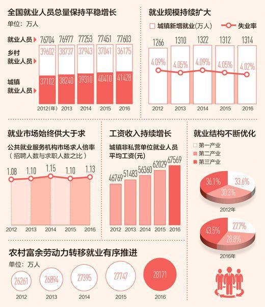 就業(yè)規(guī)模持續(xù)擴大,就業(yè)結(jié)構(gòu)不斷優(yōu)化。看產(chǎn)業(yè)分布,服務業(yè)成為吸納就業(yè)主體?闯青l(xiāng)分布,城鎮(zhèn)就業(yè)人員比重由2012年的48.4%提高到2016年的53.4%,鄉(xiāng)村就業(yè)比例降為46.6%,城鄉(xiāng)就業(yè)格局發(fā)生歷史性轉(zhuǎn)變。