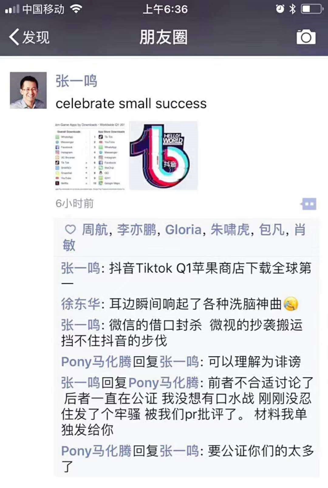 5月8日凌晨,張一鳴在朋友圈發(fā)文慶祝稱,抖音海外版Tiktok在蘋果商店取得全球下載第一。在該條朋友圈下,他說:"微信借口封殺,微視的抄襲搬運擋不住抖音的步伐"。馬化騰則在留言下回復(fù)稱,"可以理解為誹謗"。