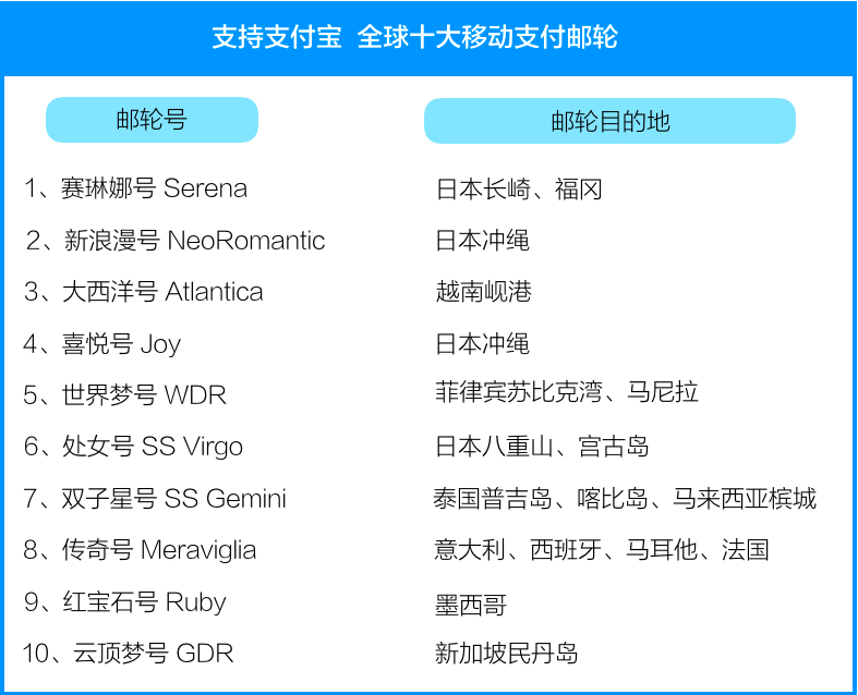 不僅是陸地商圈,支付寶表示,今年春節(jié),「海上目的地」也首次成規(guī)模接入移動(dòng)支付:包括日本沖繩、馬來(lái)西亞沙巴等在內(nèi)的十大海島成為首批接入移動(dòng)支付的海島,而中國(guó)母港出發(fā)的所有郵輪,目前也都已接入移動(dòng)支付,以方便游客的手機(jī)出游。