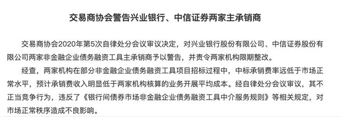 據(jù)交易商協(xié)會(huì)網(wǎng)站消息,5月15日,交易商協(xié)會(huì)發(fā)布2020年第5次自律處分會(huì)議審議決定,對(duì)興業(yè)銀行股份有限公司、中信證券股份有限公司兩家非金融企業(yè)債務(wù)融資工具主承銷商予以警告,并責(zé)令兩家機(jī)構(gòu)限期整改。