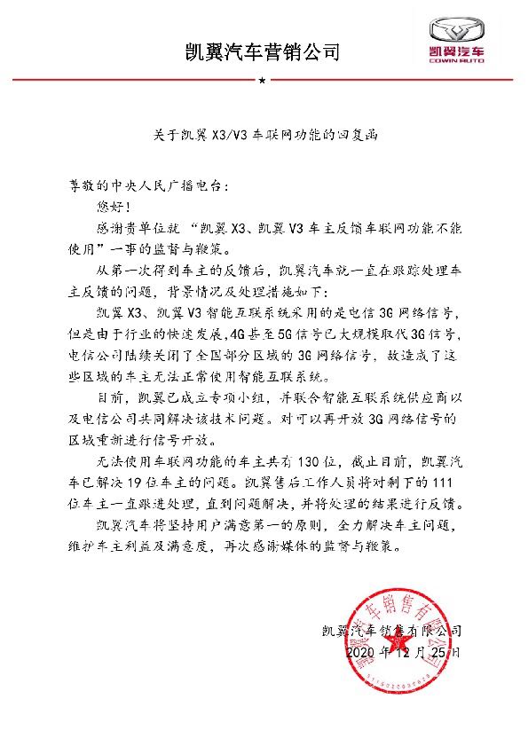 節(jié)目播出后,凱翼汽車銷售有限公司發(fā)來回復(fù)函表示,凱翼X3、凱翼V3智能互聯(lián)系統(tǒng)無法正常使用,是由于全國部分區(qū)域已經(jīng)無法正常使用3G網(wǎng)絡(luò)信號。