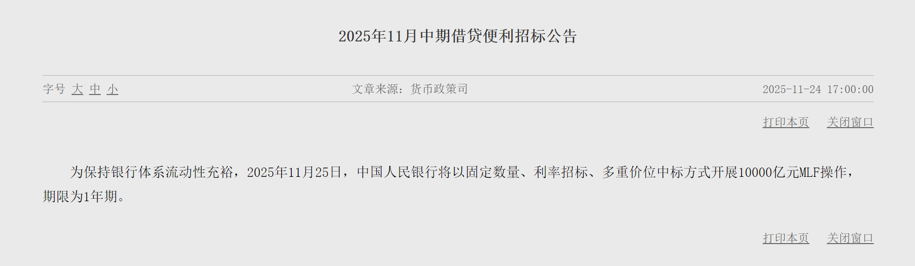 央廣網(wǎng)北京11月24日消息(記者 馮方)11月24日,央行發(fā)布公告稱,為保持銀行體系流動(dòng)性充裕,央行將于11月25日以固定數(shù)量、利率招標(biāo)、多重價(jià)位中標(biāo)方式開展10000億元中期借貸便利(MLF)操作,期限為1年期。