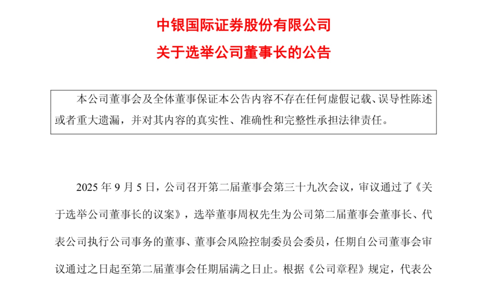 中銀證券近日發(fā)布董事長變更公告,選舉周權為董事長。