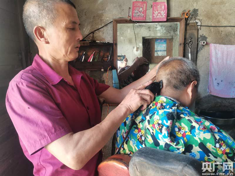 現(xiàn)年62歲的劉木茍,一身干凈整潔的暗紅色襯衫,一頭干凈利落的頭發(fā),顯得特別精神,一手拿著剪刀,一手拿著梳子,正熟練地“咔嚓咔嚓”給本村的一個(gè)村民理發(fā)。
