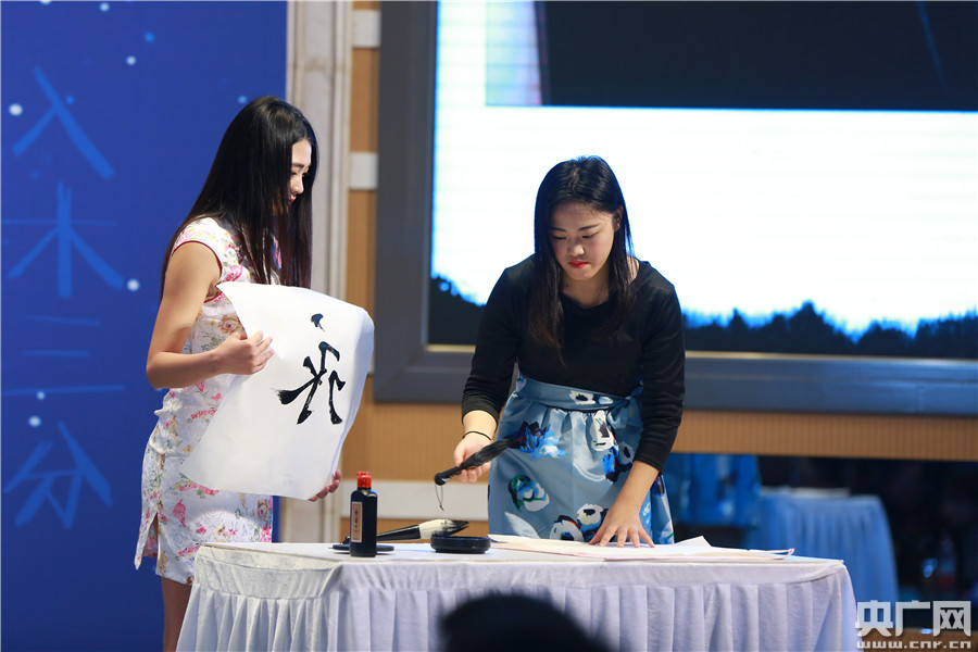 央廣網(wǎng)北京1月12日消息 昨日(11日),由方正手跡發(fā)起的“字體手護(hù)計(jì)劃”首屆年度分享交流會(huì)在北京大學(xué)舉行。教育部語(yǔ)言文字信息管理司司長(zhǎng)田立新、著名書(shū)法家葉培貴、中央人民廣播電臺(tái)央廣網(wǎng)副總編輯伍剛、方正集團(tuán)副總裁劉建應(yīng)邀出席,與現(xiàn)場(chǎng)大學(xué)生代表一起分享了有關(guān)漢字文化傳承的新形勢(shì)、新方法。圖為“字體守護(hù)大使”現(xiàn)場(chǎng)書(shū)寫(xiě)“永”字。 -