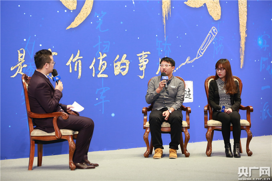 央廣網(wǎng)北京1月12日消息 昨日(11日),由方正手跡發(fā)起的“字體手護(hù)計(jì)劃”首屆年度分享交流會(huì)在北京大學(xué)舉行。教育部語(yǔ)言文字信息管理司司長(zhǎng)田立新、著名書(shū)法家葉培貴、中央人民廣播電臺(tái)央廣網(wǎng)副總編輯伍剛、方正集團(tuán)副總裁劉建應(yīng)邀出席,與現(xiàn)場(chǎng)大學(xué)生代表一起分享了有關(guān)漢字文化傳承的新形勢(shì)、新方法。圖為“字體手護(hù)大使”王少雄、王霖分享自己的手下故事。