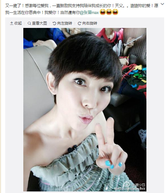 照片中,蔡少芬穿著抹胸服飾,嘟嘴比剪刀手賣萌。網(wǎng)友看到照片后紛紛送上祝福,“娘娘生日快樂”、“美女芬永遠18歲”、“張?zhí)湛鞓贰薄?/p>