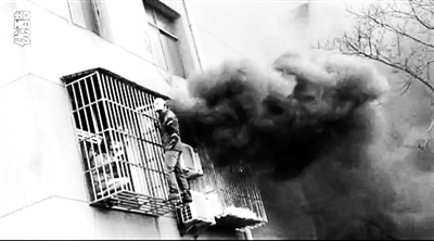 在這條10分鐘左右的視頻中,一棟居民樓中的一間屋子著火,火苗已躥出窗外,并伴有大量黑煙。在著火屋子的隔壁房間,一名女子站在陽臺防盜網(wǎng)里等待救援。而在防盜網(wǎng)外,一名身穿紅色外套、頭戴白色帽子的男子,沿著防盜網(wǎng)之間的空隙慢慢移動,試圖救出這名女子。