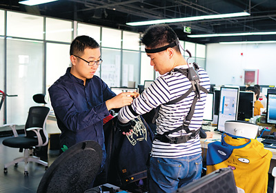 劉建(左一)在與同事做動(dòng)作捕捉調(diào)試。