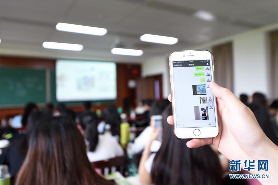 5月24日,一位同學(xué)在展示其通過微信“彈幕”發(fā)給老師和投影儀的內(nèi)容。重慶大學(xué)新聞學(xué)院大二選修課《網(wǎng)絡(luò)與新媒體》放棄傳統(tǒng)課前點名方式,通過微信對學(xué)生進行定位簽到。課程通過微信記錄下的定位簽到記錄和課堂測驗記錄都將在期末折算成平時成績。該選修課授課老師還通過微信進行課堂教學(xué),允許學(xué)生在課堂上隨時通過微信“彈幕”提問并與老師互動。新華社記者 唐奕 攝 圖片來源:新華網(wǎng)