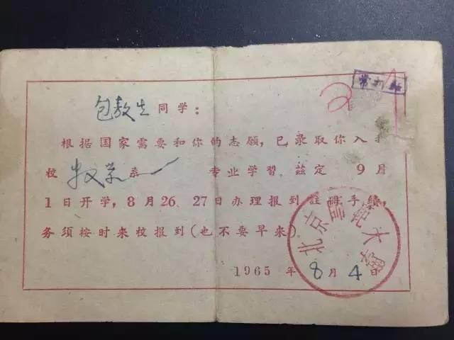 圖為1965級(jí)中文系包敖生同學(xué)錄取通知書,通知書上提示,“務(wù)必按時(shí)報(bào)到,也不要早來(lái)”。