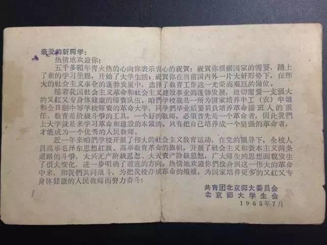 圖為新生歡迎信,稱“祝賀你在國(guó)內(nèi)外一片大好形勢(shì)下,在偉大的社會(huì)主義事業(yè)的蓬勃發(fā)展中,選擇了教育工作這一光榮而艱巨的崗位。”