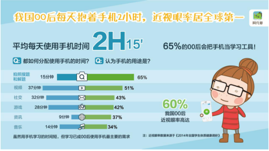 著名雕塑家羅丹曾說(shuō)“世界上并不缺少美,而是缺少發(fā)現(xiàn)美的眼睛”,可放在當(dāng)今中小學(xué)生群體中,缺少的卻是一副近視眼鏡。阿凡題《學(xué)習(xí)行為報(bào)告》顯示,我國(guó)00后近視眼率高達(dá)60%,居全球第一。而他們平均每天使用手機(jī)時(shí)間長(zhǎng)達(dá)2小時(shí)15分鐘,其中平均刷視頻37分鐘、網(wǎng)上聊天32分鐘、打游戲28分鐘、上網(wǎng)拍照搜題15分鐘,聽(tīng)音樂(lè)和看新聞則分別占用14分鐘和9分鐘。但調(diào)研顯示,使用時(shí)間長(zhǎng)短并不與00后的使用需求直接相關(guān)。如雖然平均每天只花15分鐘進(jìn)行拍照搜題搞定作業(yè),卻有65%的00后都會(huì)選擇把手機(jī)當(dāng)作學(xué)習(xí)工具,換言之,學(xué)習(xí)已成為00后使用手機(jī)最主要的需求。