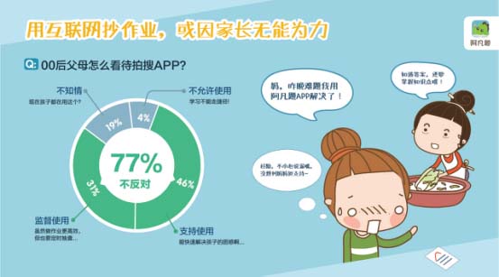 面對(duì)00后的作業(yè)難題,更多家長(zhǎng)有苦難言,即使他們這一代受大專(zhuān)以上教育水平的人數(shù)比10年前增長(zhǎng)近3倍,但是對(duì)于輔導(dǎo)孩子功課這件事,依然是力不從心,所以,支持或陪伴孩子使用互聯(lián)網(wǎng)學(xué)習(xí)工具成為了他們的主要選擇。據(jù)統(tǒng)計(jì),77%的家長(zhǎng)不反對(duì)使用拍搜APP,其中46%的家長(zhǎng)認(rèn)為“能快速解決孩子的困惑”;而考慮到未成年人自覺(jué)性欠缺,31%的家長(zhǎng)選擇監(jiān)督和陪伴使用;不允許孩子使用拍照搜題的家長(zhǎng)僅為4%。