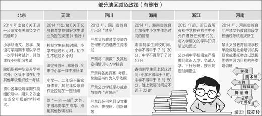 有的地區(qū)如河南,除了實(shí)施小學(xué)就近入學(xué)和取消小升初考試,同時(shí)還禁止義務(wù)教育階段學(xué)校單獨(dú)或與社會(huì)培訓(xùn)機(jī)構(gòu)聯(lián)合舉辦培訓(xùn)班。有的地區(qū)選擇以減少平時(shí)考試次數(shù)為切入點(diǎn)。北京規(guī)定,小學(xué)除語文、數(shù)學(xué)、英語每學(xué)期期末可以舉行一次全;蛉昙(jí)學(xué)科考試外,其他課程不得組織考試。有的地區(qū)則對(duì)中小學(xué)生在校時(shí)間和課后作業(yè)有明確的規(guī)定,如天津要求小學(xué)生在校時(shí)間不得超過6小時(shí),一、二年級(jí)不留家庭作業(yè)。
