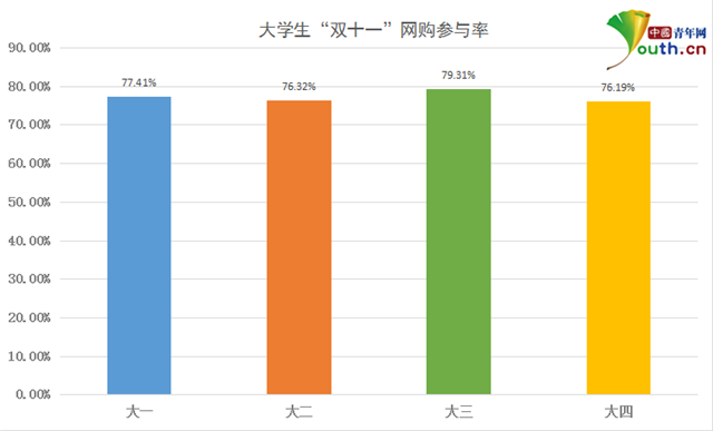 根據(jù)中國(guó)青年網(wǎng)調(diào)查數(shù)據(jù),530名受訪學(xué)生中,有410名學(xué)生參與“雙十一”網(wǎng)購(gòu),占受訪總?cè)藬?shù)的77.36%;158名受訪男生中,78.48%參與了網(wǎng)購(gòu),372名受訪女生中,76.88%參與了網(wǎng)購(gòu);大一至大四學(xué)生參與網(wǎng)購(gòu)比例分別為77.41%、76.32%、79.31%和76.19%。