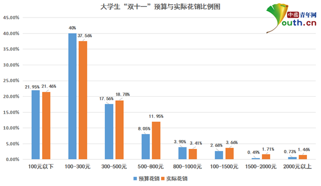 根據(jù)中國(guó)青年網(wǎng)調(diào)查結(jié)果顯示,40%的大學(xué)生網(wǎng)購(gòu)預(yù)算為100-300元,其次為100以下、300-500元,分別占21.95%、17.56%。在實(shí)際花費(fèi)中,37.56%的網(wǎng)購(gòu)大學(xué)生實(shí)際消費(fèi)為100-300元;其次為100元以下、300-500元,各占21.46%和18.78%。71.46%的大學(xué)生認(rèn)為自己“雙十一”網(wǎng)購(gòu)實(shí)際消費(fèi)沒有超出預(yù)算,同時(shí)也有近3成大學(xué)生的網(wǎng)購(gòu)消費(fèi)額度超出預(yù)算,變“剁手族”。