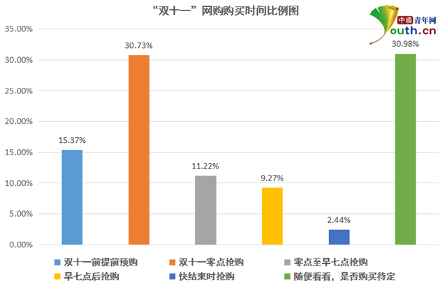 根據(jù)中國(guó)青年網(wǎng)調(diào)查數(shù)據(jù)顯示,在網(wǎng)購(gòu)時(shí)間上,30.73%的學(xué)生選擇“雙十一”零點(diǎn)搶購(gòu),其次為提前預(yù)購(gòu)和零點(diǎn)至早七點(diǎn)搶購(gòu),分別占15.37%、11.22%。另外,有30.98%的學(xué)生選擇隨便看看,是否購(gòu)買待定。這說(shuō)明,多數(shù)大學(xué)生決定在“雙十一”期間進(jìn)行搶購(gòu),消費(fèi)動(dòng)機(jī)明確。