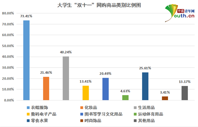 圖為大學(xué)生“雙十一”網(wǎng)購(gòu)商品類別比例。中國(guó)青年網(wǎng)實(shí)習(xí)記者 李華錫 制圖