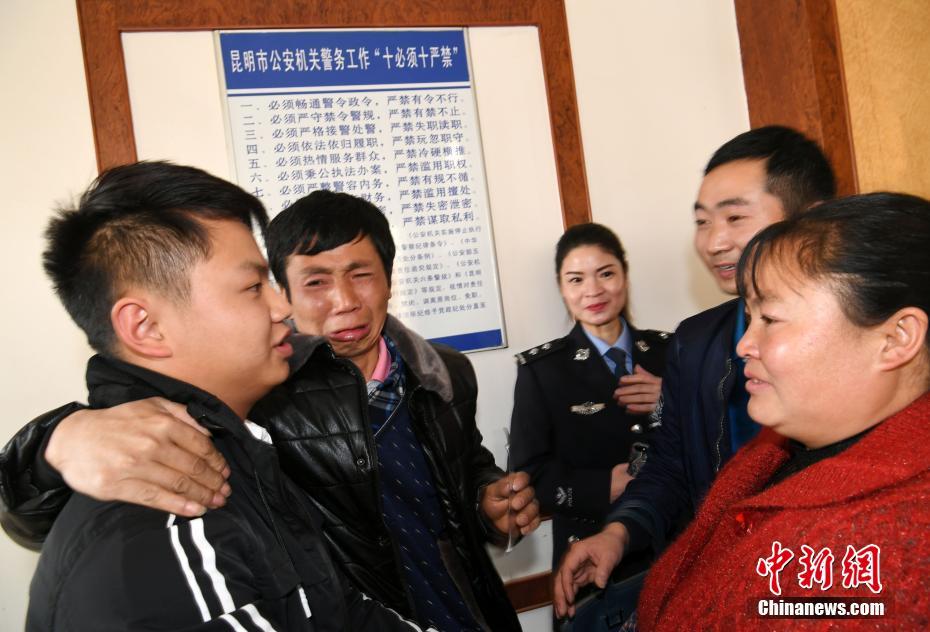 2月23日,小周和親生父母相見時,父母淚流滿面。當(dāng)日,20年前在貴州省失蹤的周躍欽夫婦2歲半兒子小周,在貴州和云南兩省警方努力幫助下,通過DNA血樣比對成功,現(xiàn)在已經(jīng)22歲的小周與自己的親生父母、弟弟在昆明團聚,一家人相擁而泣。這些年來,周躍欽夫婦一直沒有放棄找兒子,并將自己的DNA血樣在公安機關(guān)進行采集備案。為了找到親生父母,2016年,小周也在昆明市公安局進行了DNA和指紋采集。據(jù)介紹,采血入庫比對,是被拐孩子尋親的捷徑。中新社記者 李進紅 攝