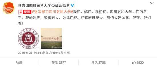 在瀘州醫(yī)學(xué)院一方,微博上出現(xiàn)了#堅(jiān)決捍衛(wèi)四川醫(yī)科大學(xué)#的話題:“2015.4 我校合理、合法、合規(guī)的更名為四川醫(yī)科大學(xué)。新校名授牌儀式完成,四川大學(xué)華西醫(yī)學(xué)中心一改最初恭喜祝賀的態(tài)度,強(qiáng)烈反對(duì)。6 月 26 日全校學(xué)子在校內(nèi)集體發(fā)起訴求:堅(jiān)決捍衛(wèi)四川醫(yī)科大學(xué)!”