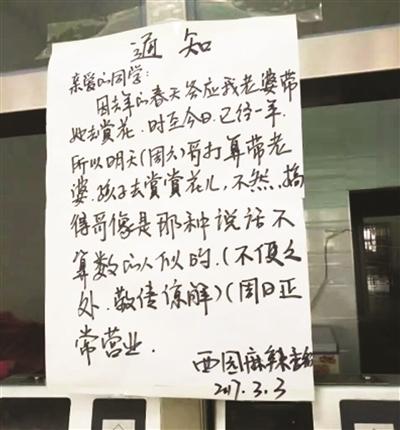 今年3月7日,多名該院同學(xué)在網(wǎng)上發(fā)布的一則趣聞,引大量網(wǎng)友關(guān)注:該校食堂一麻辣香鍋大廚一年半來(lái),先后貼出的4張暫停業(yè)通知單,連成了一條“人生贏家之路”。4張停業(yè)通知分別是:2015年中秋因回家相親停業(yè)一天、因中秋相親失敗圣誕期間再相親停業(yè)兩天、去年底因老婆臨產(chǎn)停業(yè)三天、今年3月初帶老婆孩子去看花停業(yè)一天。相較平日常見(jiàn)的“因故停業(yè)”通知,這些通知頗顯另類。
