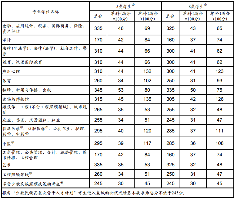 2017年全國碩士研究生招考考生進入復試的初試成績基本要求(專業(yè)學位類)