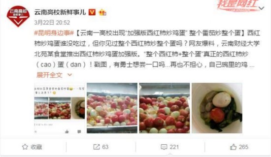 22日晚,微博用戶“云南高校新鮮事兒”發(fā)布了一條博文稱“網(wǎng)友爆料,云南財經(jīng)大學北苑某食堂推出西紅柿炒雞蛋加強版,整個西紅柿+整個蛋”,引得微博用戶紛紛轉發(fā)。云南財經(jīng)大學的學生們秒變“段子手”,紛紛在博文評論中吐槽、逗趣、認校友.....。。