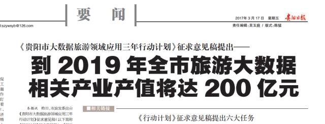2017年3月16日,貴陽市旅發(fā)委出臺《貴陽市大數(shù)據(jù)旅游領(lǐng)域應(yīng)用三年行動計(jì)劃》征求意見稿。征求意見稿提出,創(chuàng)新旅游行業(yè)管理和旅游公共服務(wù)模式,到2019年,全市打造智慧旅游示范企業(yè)3至5個,引進(jìn)和培育大數(shù)據(jù)旅游企業(yè)5至10家,旅游大數(shù)據(jù)相關(guān)產(chǎn)業(yè)產(chǎn)值將達(dá)200億元,旅游業(yè)態(tài)逐步向綜合性、融合性轉(zhuǎn)型。