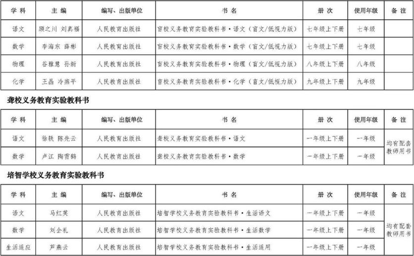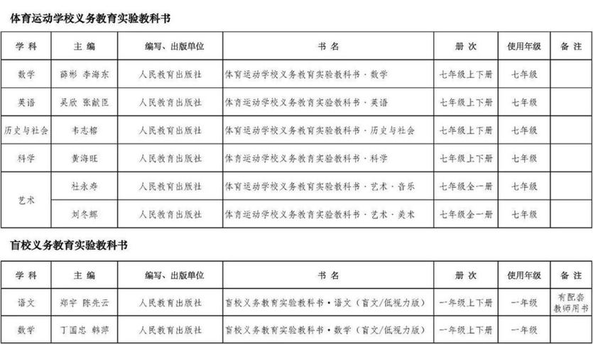 值得注意的是,體育運(yùn)動(dòng)學(xué)校初中階段起始年級(jí)《道德與法治》《語文》使用國(guó)家統(tǒng)編教材,其他學(xué)科使用體育運(yùn)動(dòng)學(xué)校專用新編實(shí)驗(yàn)教材。其他年級(jí)仍沿用原選用出版社出版的教材。特殊教育學(xué)校義務(wù)教育階段相關(guān)學(xué)科起始年級(jí)使用特殊教育新編教材。