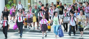 昨日一大早,越秀區(qū)的街道上滿是趕回學校的孩子和家長。廣州日報全媒體記者黎旭陽 攝