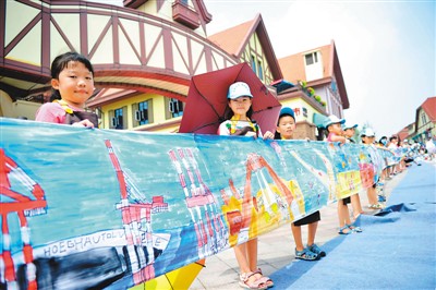 近日,在山東青島,百余名兒童在百米長卷上作畫,描繪自己心目中的家鄉(xiāng)。