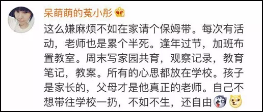 不過,有家長反對幼兒園親子活動太多的,就有家長認(rèn)為,幼兒園的活動應(yīng)該更豐富一點,明明準(zhǔn)備好了給孩子過節(jié)日,結(jié)果學(xué)校沒有安排也是很心塞。
